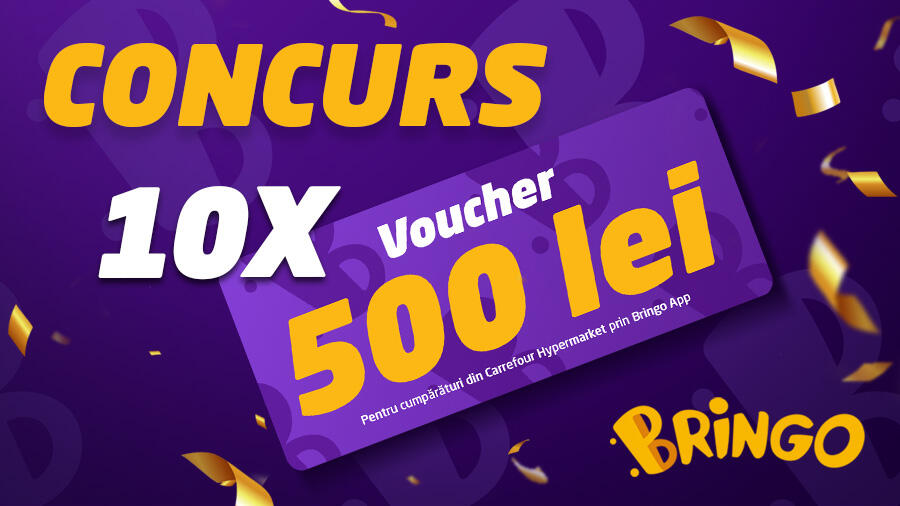 Voucher in valoarea de 500 de lei fiecare pentru cumparaturi din magazinele Carrefour Hypermarket prin aplicatia Bringo.Termeni & conditii vouchere: